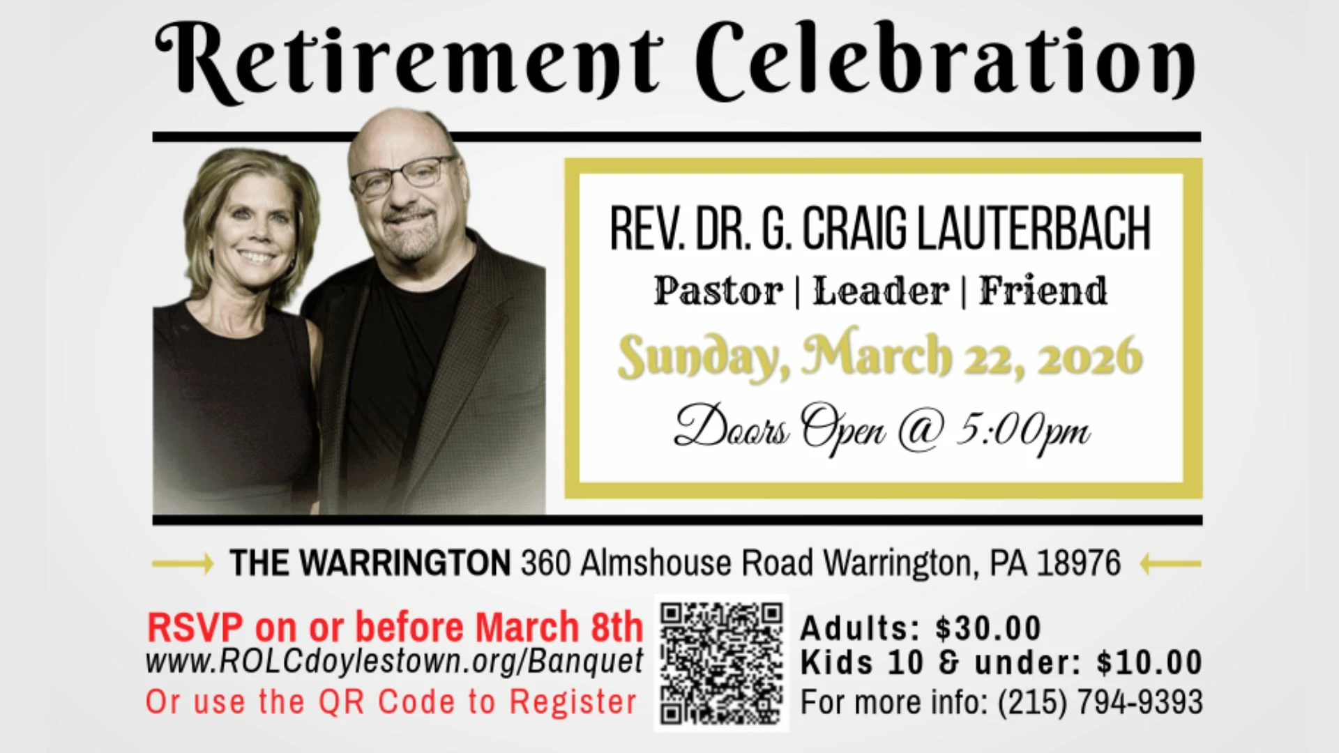 Join us in celebrating the retirement of Pastor Craig Lauterbach on Sunday, March 22, 2026 at 5:00pm at The Warrington. Please RSVP by 3/8 at www.ROLCdoylestown.org/Banquet .